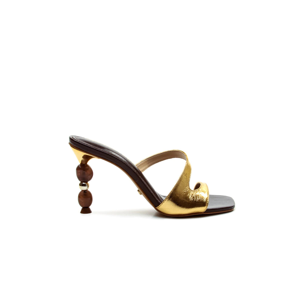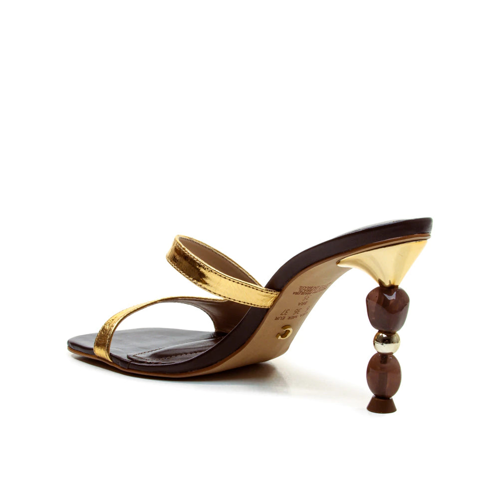 Chic, sculptural, and effortlessly refined — the Gilded Sphere Sandal brings modern artistry to elevated footwear. Crafted with a rich contrast of metallic gold leather and deep-toned leather accents, it features a fluid open-toe silhouette that gracefully hugs the foot. The standout spherical heel design creates a striking visual balance, blending bold structure with elegant curvature. Designed to make an impression from every angle, Gilded Sphere is a statement piece that transitions seamlessly from sophisticated daytime styling to elevated evening looks.