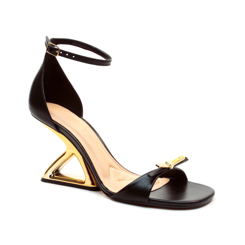 Chic, bold, and architecturally refined — the Noir Apex Sandal redefines modern glamour through sculptural design and polished minimalism. Crafted from black leather, it features a clean open-toe silhouette accented by a refined front strap with subtle metallic detailing. The striking geometric heel creates a powerful visual statement, blending futuristic elegance with impeccable balance. Designed to elevate both day and evening looks, Noir Apex embodies confidence, innovation, and timeless allure.