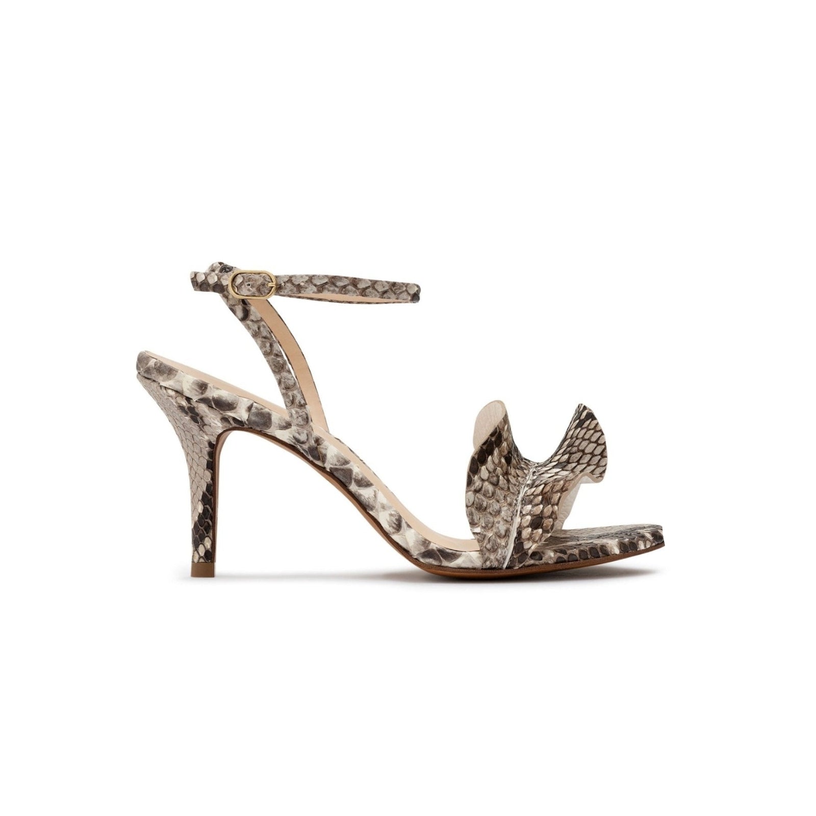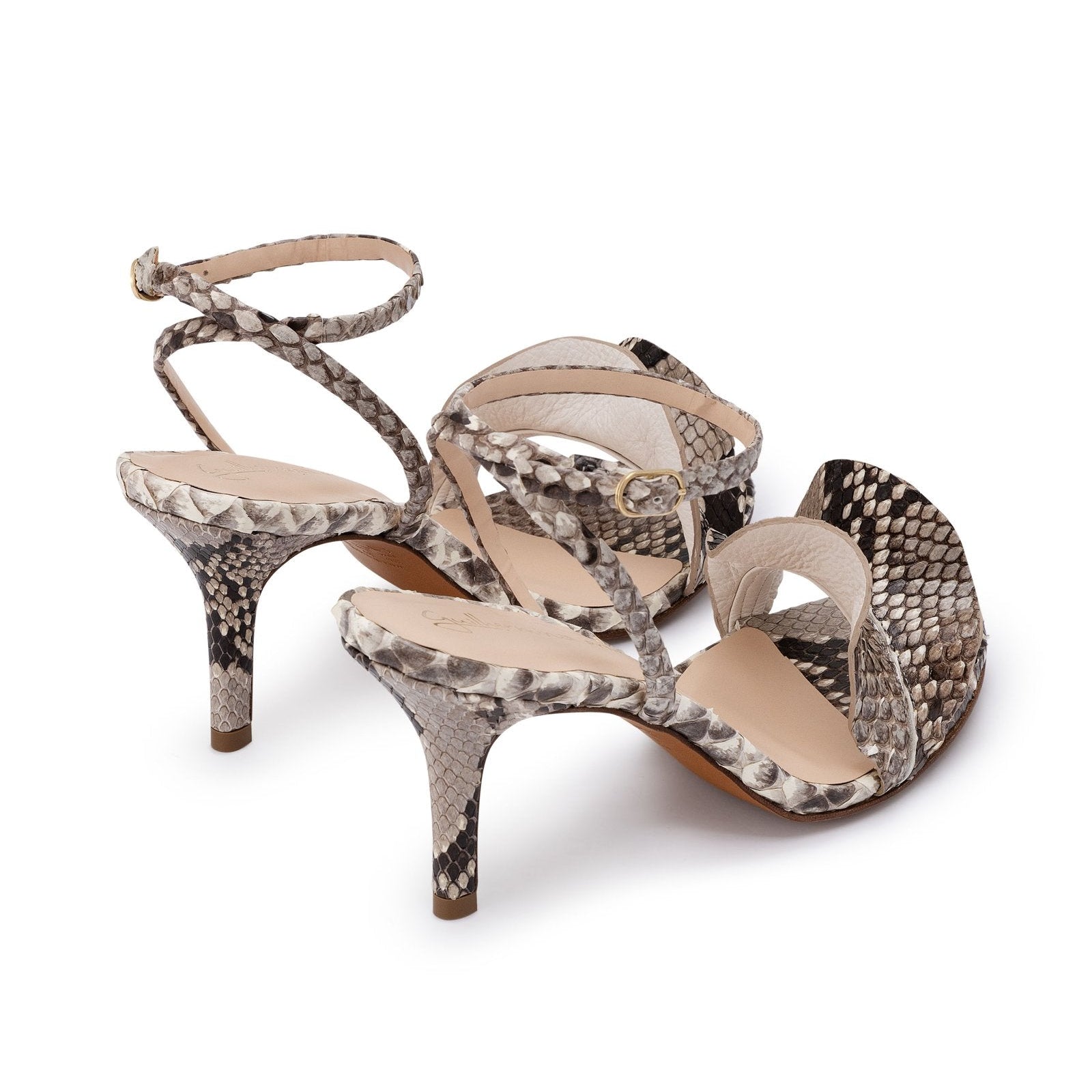 Bold sophistication meets timeless elegance in the Serpent Muse Sandal, a striking design for women who embrace style with confidence and grace. Crafted from luxurious leather, it features a sculptural strap adorned with serpent-print calf hair, creating a captivating mix of texture and modern allure. The delicate ankle strap ensures a refined fit, while the elegant sculpted heel offers height and comfort in perfect balance. A daring yet elegant statement for every occasion.