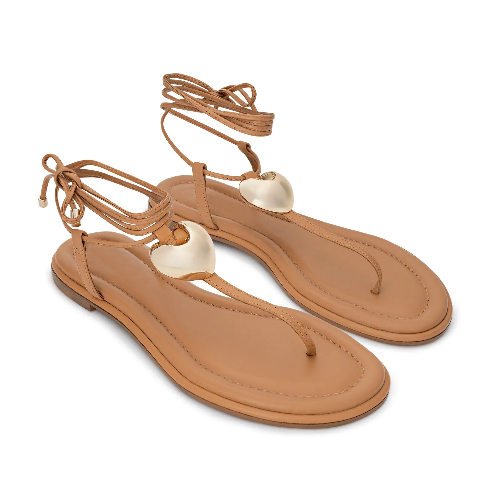 Timeless romance meets effortless elegance in the Sweetheart Caramel Flat Sandal, a delicate expression of modern femininity. Crafted from luxurious soft glove leather, it features a minimalist silhouette adorned with a golden heart detail that adds a subtle touch of charm and sophistication. With adjustable ankle-tie straps and a lightweight sole, it offers all-day comfort and style — perfect for warm days, seaside escapes, and chic summer moments.
