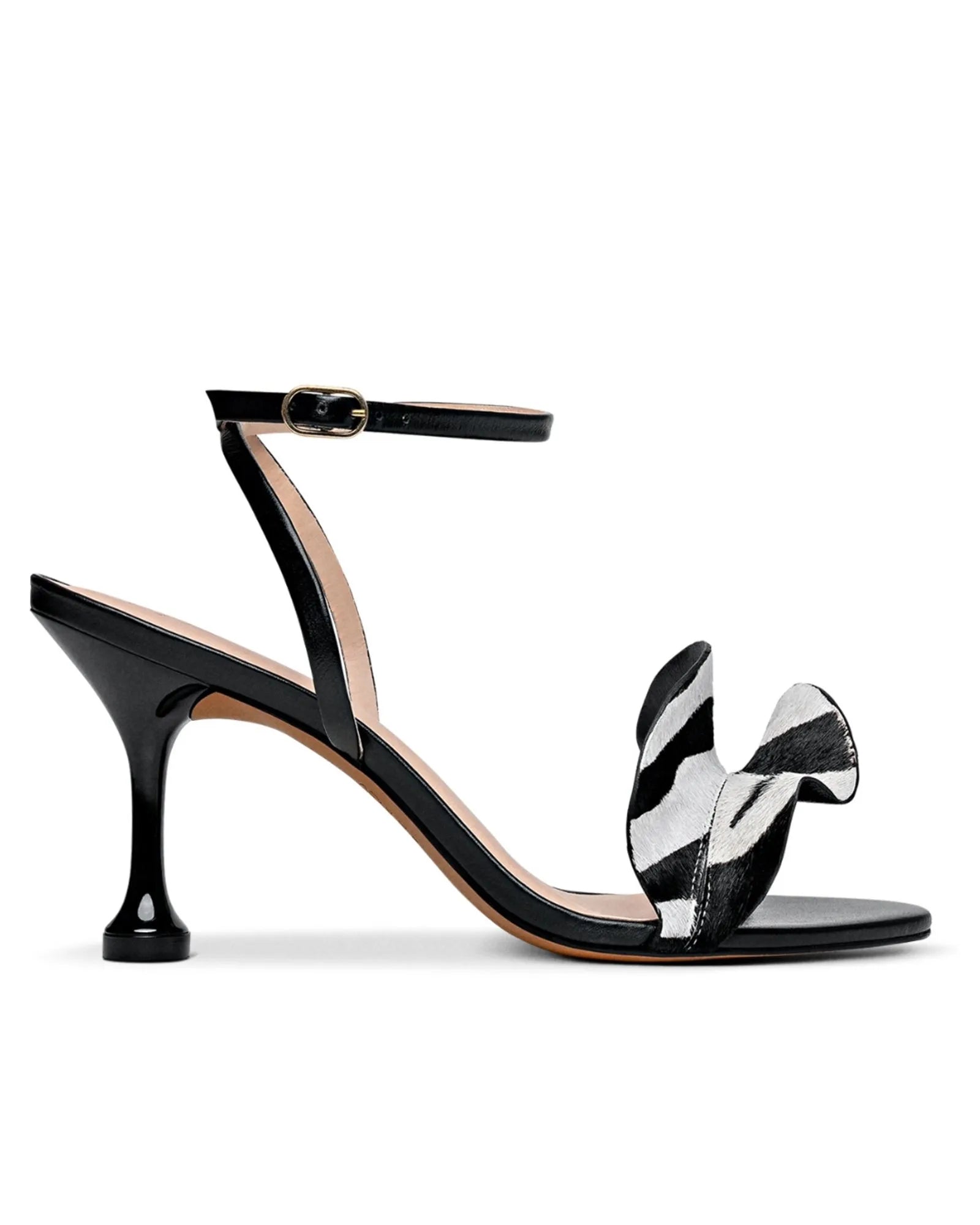 Bold sophistication meets timeless elegance in the Zebra Muse Sandal, a striking design for women who embrace style with confidence and grace. Crafted from luxurious black napa leather, it features a sculptural strap adorned with zebra-print calf hair, creating a captivating mix of texture and modern allure. The delicate ankle strap ensures a refined fit, while the elegant sculpted heel offers height and comfort in perfect balance. A daring yet elegant statement for every occasion.